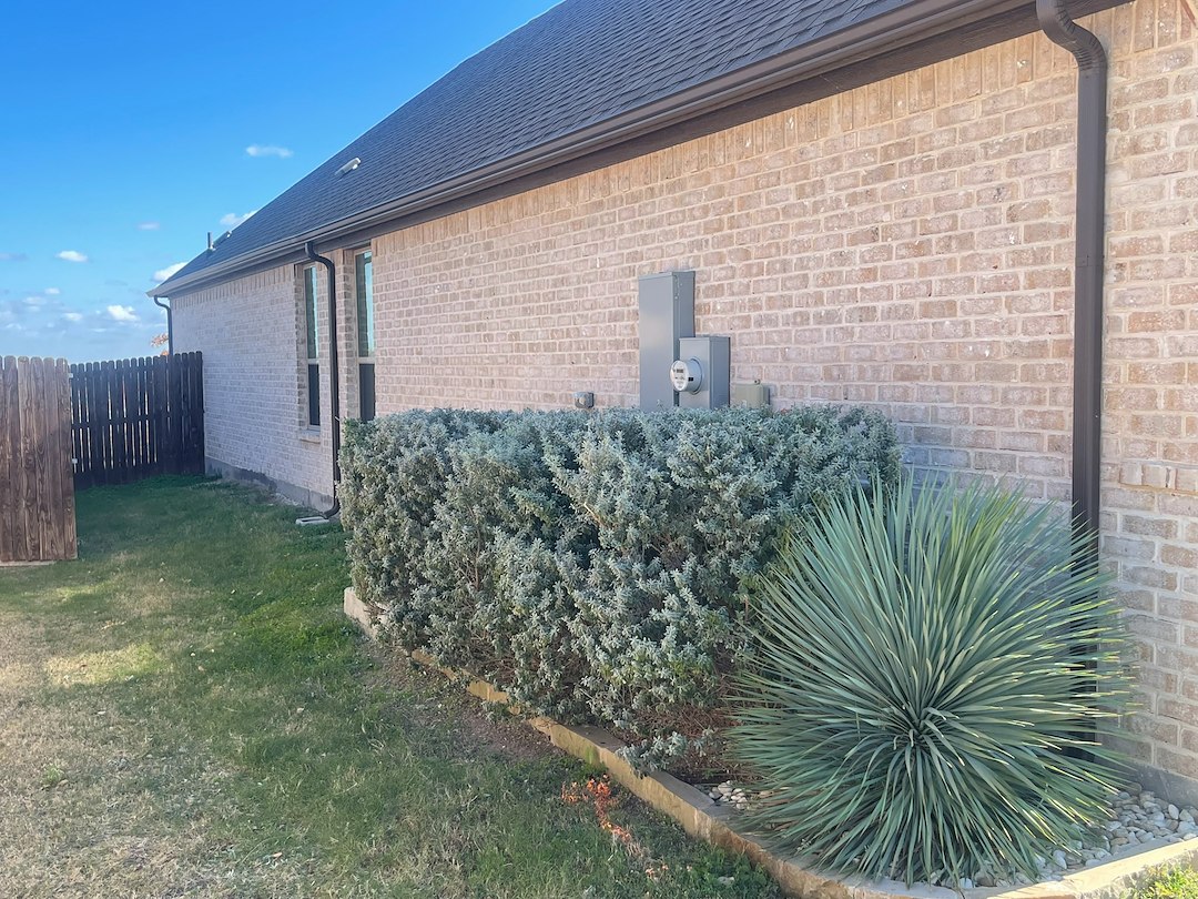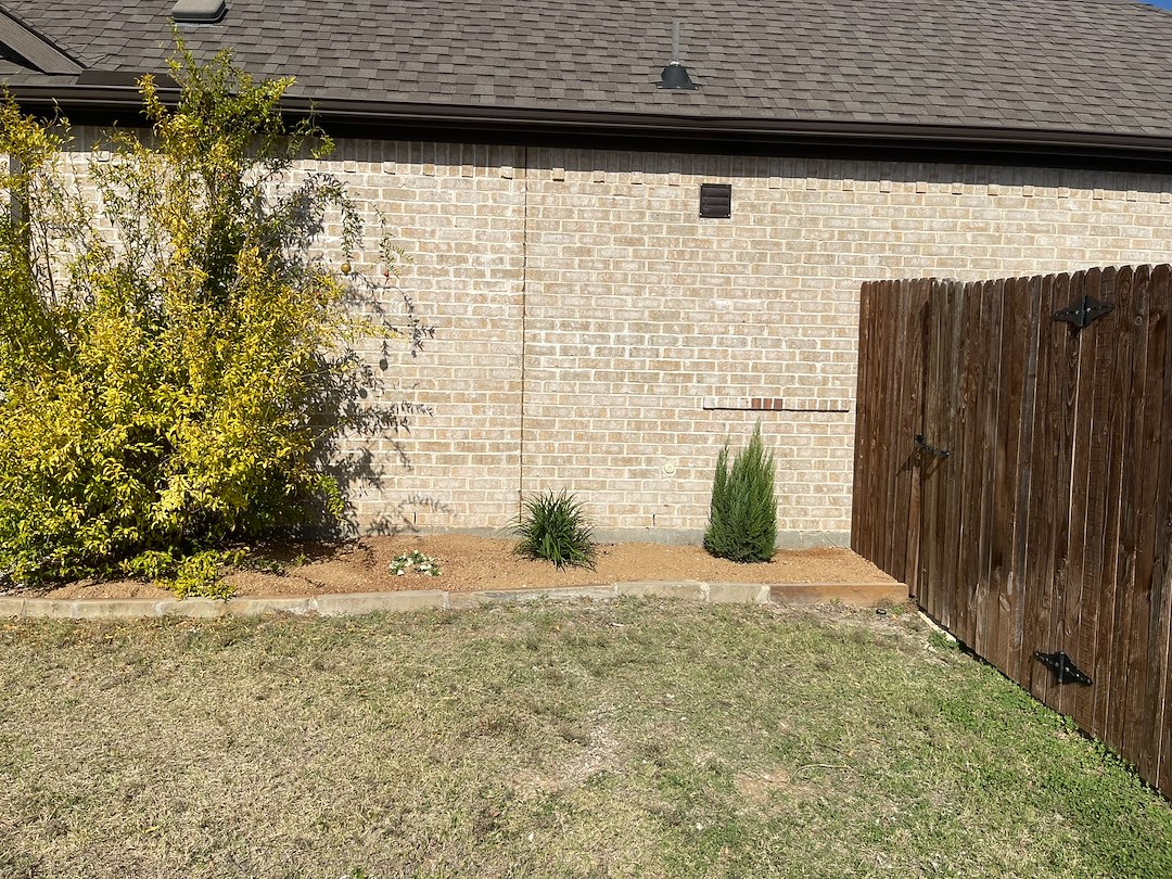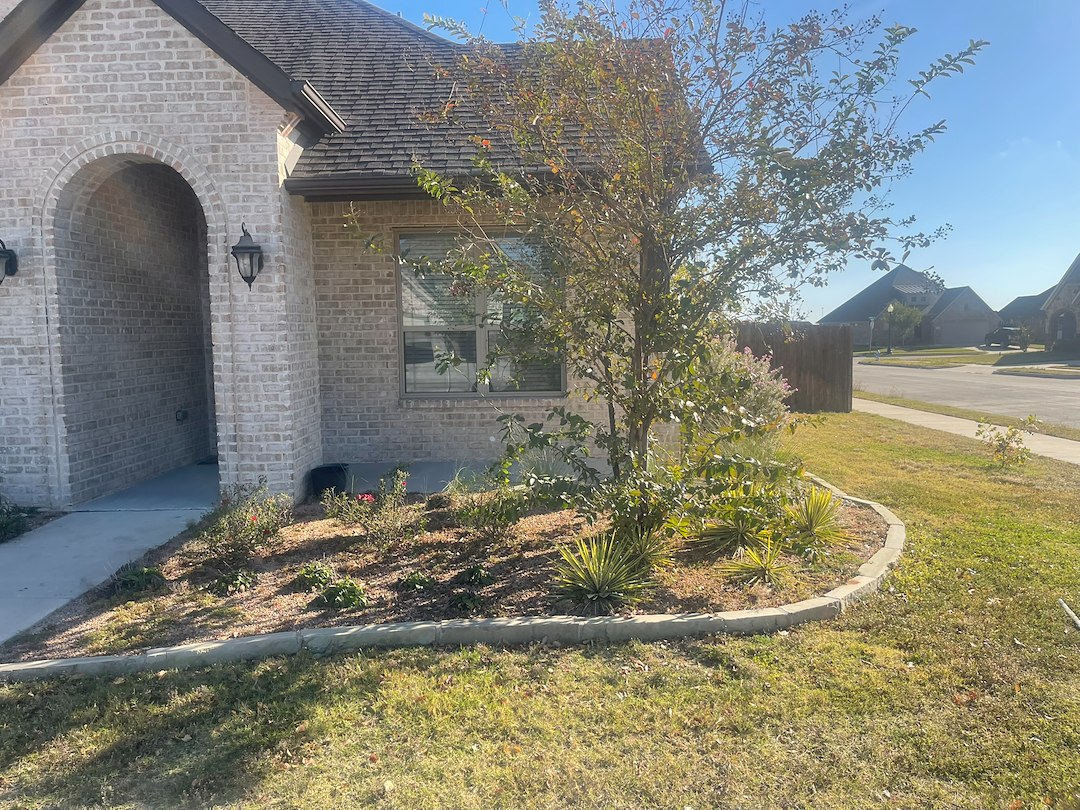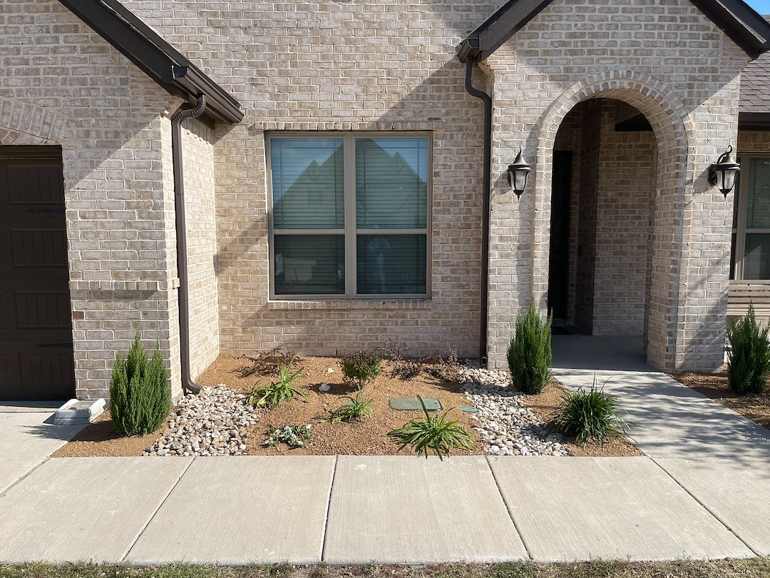 This landscaping refresh for a Waxahachie, TX flowerbed creates a beautiful, low-maintenance, and drought-tolerant design by combining durable plants with a modern, water-wise finish of decomposed granite. Plants used include loropetulum, agapanthus, liriope, abelia, and blue point junipers.